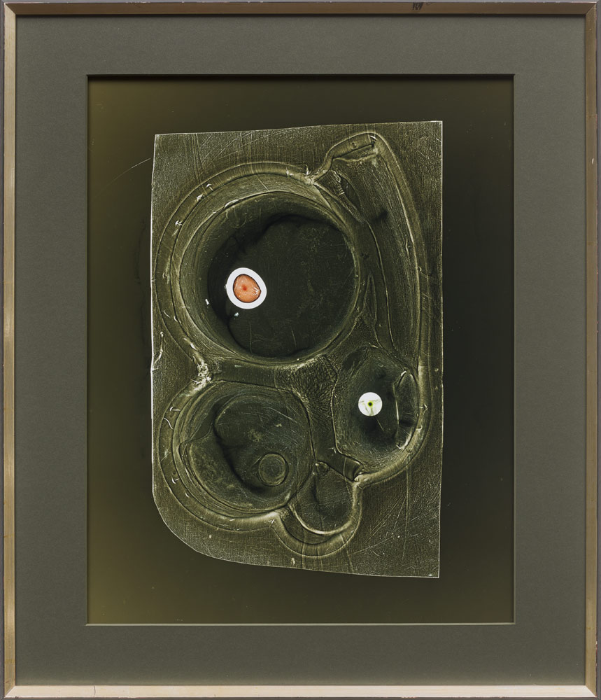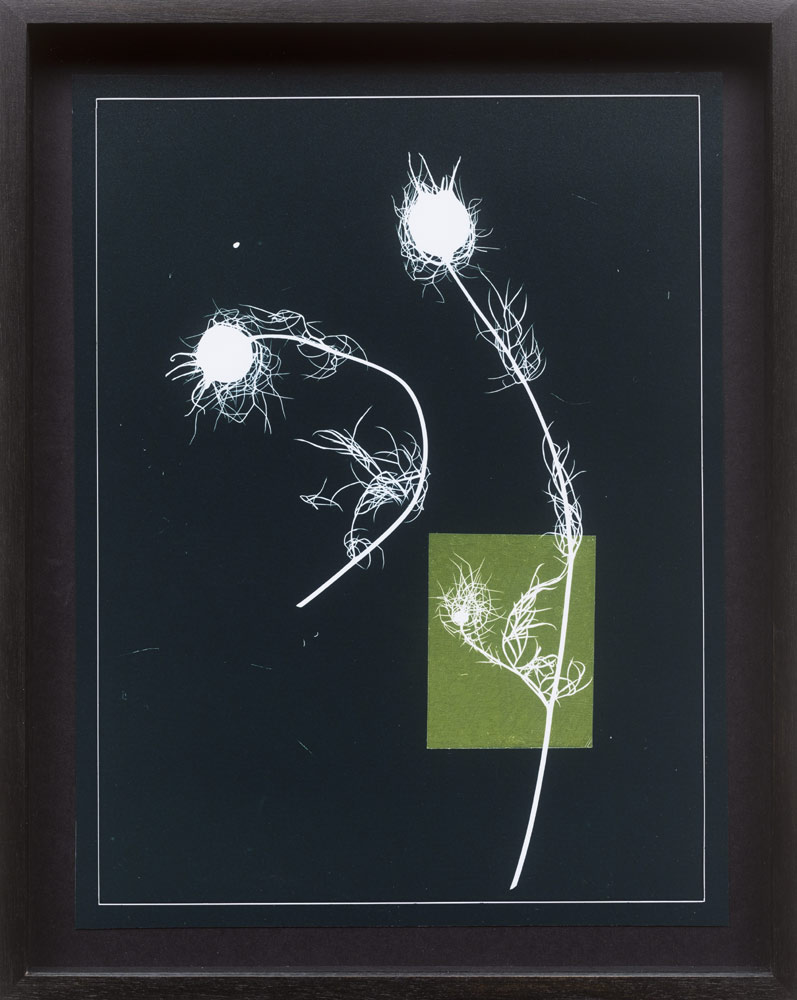 Bei dem analogen Verfahren des Fotogrammes legt die Künstlerin gläserne Gegenstände, Pflanzen, Plastikmüll und ähnliches direkt auf das Fotopapier und belichtet dieses.